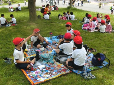昼食は「大芝生広場」でいただきました。お弁当を食べた児童から、おやつをいただき、その後は「おにごっこ」や「だるまさんがころんだ」など、みんな遊びをしました。14時30分、無事に学校に帰ってきました。