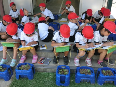 6月2日(金)3・4限、1年生は生活科の授業で「学習園」にやってきました。5月に種をまき、毎日水やりをした「あさがお」は、やっとふた葉が出てきました。たんけんボードにワークシートをはさんで、発芽したふた葉や本葉の絵を描いていきました。その後は、全員で5年生の田んぼで、オタマジャクシの観察をしました。
