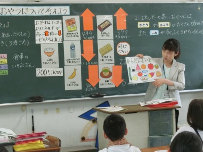 6月8日(木)2限、3年生では城東区内小学校の栄養教諭の先生に来ていただき、栄養教育「おやつについて考えよう」の学習をしました。