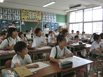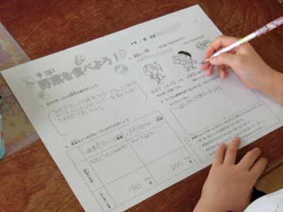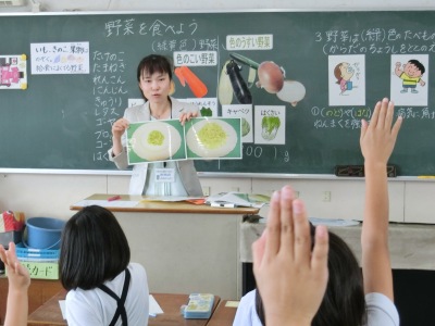 自分の知っている野菜をワークシートに書きあげ、ピーマン、カボチャなど色の濃い野菜と、キャベツ、白菜など色のうすい野菜に分けました。野菜は「のどや鼻の粘膜を強くする、病気に負けない体をつくる、便秘を防ぐ」という働きをすることを学びました。野菜は一日に300g食べないといけません。小学校の給食では、100gの野菜が出てきますが、残りの200gを食べるためには、どうすればよいかをみんなで考えました。