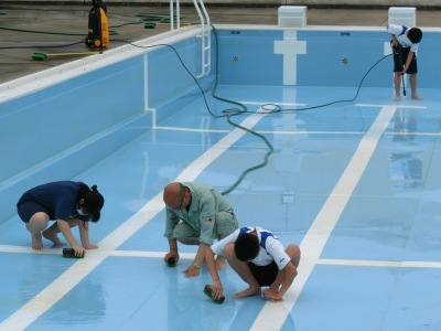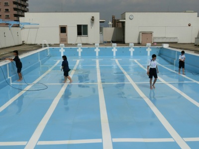 始業前の児童集会であいさつの後、体操服に着替えて、午前中は管理作業員さんと一緒に、プール清掃を手伝っていました。おかげでプール水槽は、ピカピカになりました。昼休みには児童とバスケットボール【写真右】をして遊んだり、教室で清掃の手伝いをしました。いろいろな作業や活動を通して、働くことの喜びと厳しさを学んでほしいと思います。