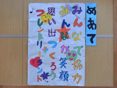 8時40分から各お店の準備にかかり、9時から体育館で開会式を行いました。今年度のめあては「みんなで協力 みんなが笑顔 思い出つくろう フレンドリーランド」です。各お店の「30秒CM」【写真左】の後、2班が1組になり、前半・後半に分かれて、お店の運営役とお客さん役になります。土曜授業のため、保護者の方も多数参観されています。