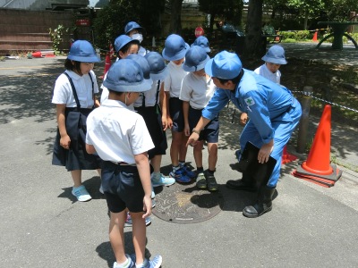 会議室でビデオを見た後【写真左】、下水処理の工程順に「沈砂池・沈でん池・反応タンク・沈ちょう池・消毒室」の順に施設見学をしました。最初は汚れていた水が、処理が進むにつれて透明になっていく様子がわかりました。下水処理場の第一の目的は「浸水から街を守る」ということや微生物の働きを利用して水をきれいにしているということを知りました。最後は、マンホールについて学習【写真右】し、下水処理の大切さとみんなが気をつけることで、水はきれいになるということを学びました。