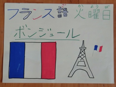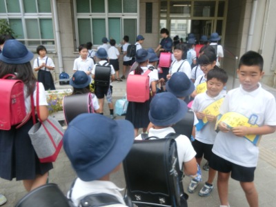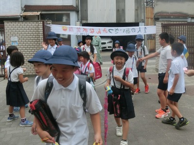 7月4日(火)8時、台風3号が本州に接近しており、外はどんよりと曇っています。今日は「あいさつ週間3日目」で、なかよし班7・8・9班がフランス語で「ボンジュール」とあいさつ運動を行いました。