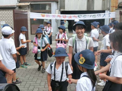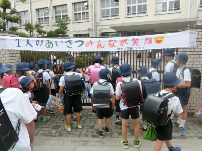 7月6日(木)8時前、なかよし班13・14・15班の34名が登校し、あいさつ運動の準備をしました。8時5分、開門前にはもうたくさんの児童が登校【写真左】していました。