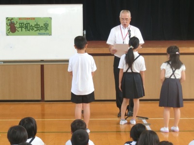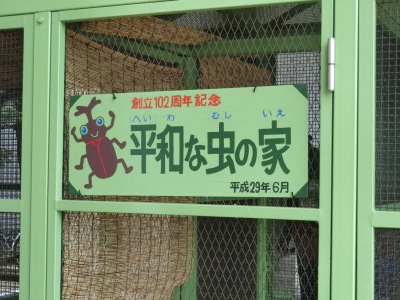 創立102周年を記念して、飼育小屋をリフォームしてネーミングを募集したところ、カブト虫の家、カブト虫のやかた、カブランド、中浜の宝小屋など、153通の応募がありました。飼育小屋の名前は「平和な虫の家」に決まりました。特別賞として「かぶかぶらんど」「ビートルキャッスル」が選ばれ、賞状が渡されました。