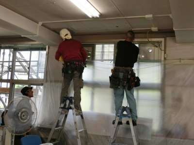 7月21日(金)、今日から本格的な工事が始まりました。西校舎の職員室などの管理室と多目的室・音楽室・図書室、北校舎の保健室・パソコン教室の「空調機(エアコン)取替工事」【写真左・中】を行っています。また、2学期から親子方式による給食に伴い、「給食調理室改修工事」【写真右】も行っています。他にも教室床の補修工事や黒板取替工事なども行う予定です。