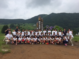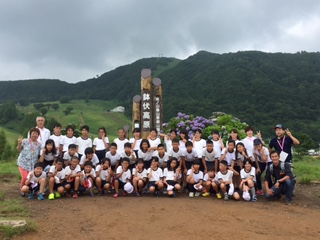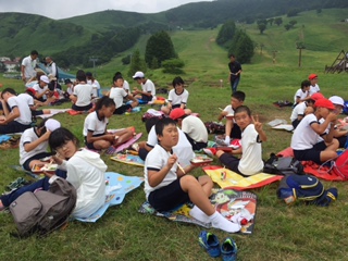 12時、ハチ高原のモニュメント前で、学年毎で集合【写真5年生は左、6年生は右】を撮りました。その後は、活動班に分かれて「昼食」の幕の内弁当をいただきました。