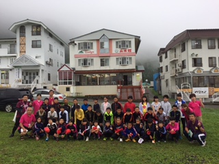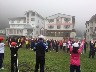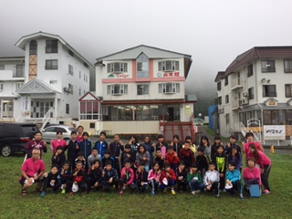 2日目の起床は6時30分でした。洗面の後、宿舎前の広場で「朝の会」を行いました。体調を崩す児童もなく、元気に2日目の朝を迎えました。ラジオ体操【写真中】の後、校長先生、児童からのあいさつがあり、学年別に集合写真【左:5年生、右:6年生】を撮りました。今日は鉢伏山登山、野外炊飯、魚つかみ、キャンプファイヤー、花火と少しハードになります。