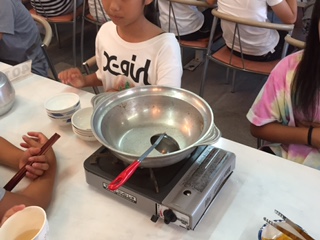 18時、林間学習2日目の夕食は、但馬地方の名物料理「かも鍋」です。あらかじめ〆用のラーメンも入れてから煮込みました。食事が始まって10分後には、出汁まできれいにいただき、雑炊をしていた班がありました。よほど、おいしかったのでしょう。