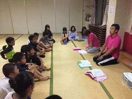21時には部屋にもどり、各自が「一日の反省表」を書きました。部屋長はその「一日の反省表」を持参して、大広間で就寝前の「部屋長会議」【写真右】を行いました。今日一日の反省と明日の予定について、確認をしました。長い一日の活動が終わりました。