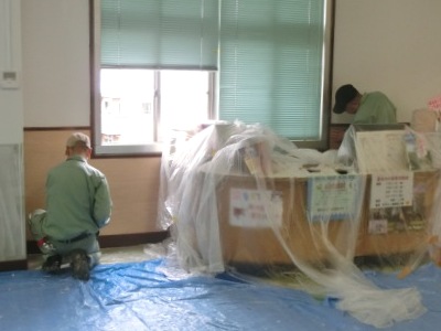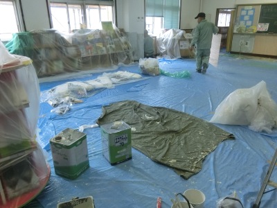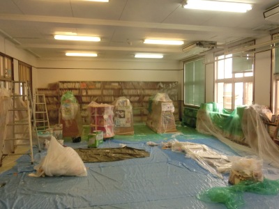 35日間の夏休みは、今日でちょうど半分が終わりました。学校の方も特別教室のエアコン工事や給食調理室の改修工事が着々と進められています。西校舎3階の図書室は、内壁がくすんで暗かったので、管理作業員さんによって「図書室内壁塗装工事」を行っています。受付カウンターの後ろの腰板部分の雨漏り補修【写真中】もあわせて行っています。2学期には明るくなった図書室で、読書活動や調べ学習を行ってください。