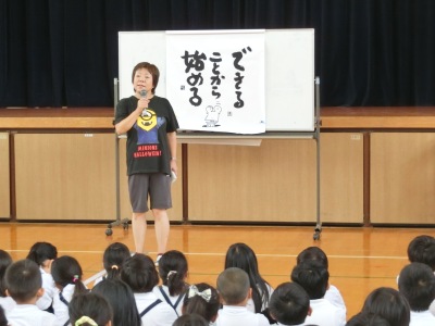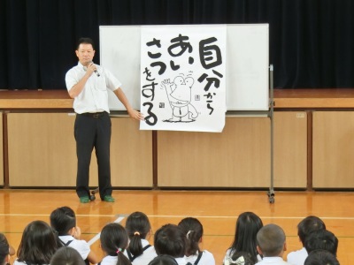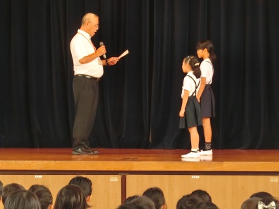 8月28日(月)始業前、体育館で2学期初めての「児童朝会」を行いました。まず朝のあいさつを元気よくした後、「大阪市小学校児童会が・版画展」の賞状伝達【写真左】がありました。