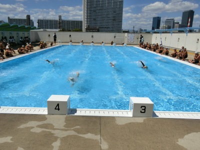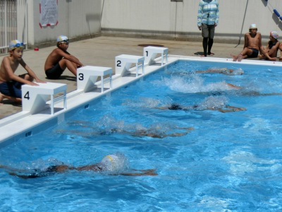 競技は、ビート板・犬かき・バタ足・クロール・平泳ぎです。全員がいずれかの競技に参加しました。競技の後、6年生は小学校生活最後の25mを自由形で泳ぎました。最後は自由水泳【写真右】で、全員が一斉にプールにはいって、この夏の終わりを楽しみました。
