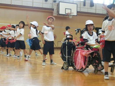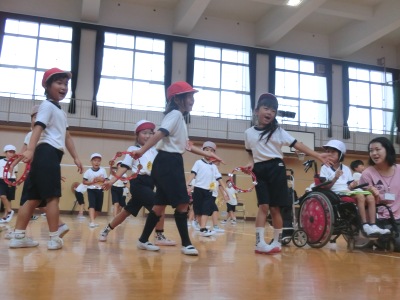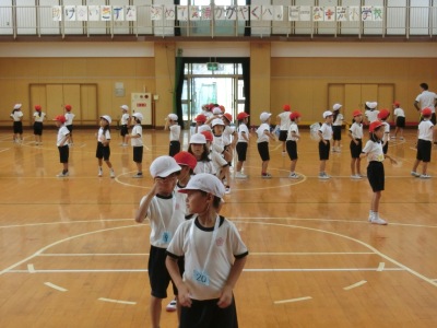 三太郎音頭、やってみようの音楽にあわせて、楽しそうにダンスを踊りました。1年生はダンスの練習を始めたばかりなのに、もう覚えているのには驚きました。今日は番号の書いた赤・青・黄色のメダルをぶら下げて、自分の位置の確認しながら練習をしました。全員が「ノリノリ」で踊っているのが印象的でした。