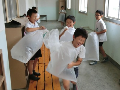 9月15日(金)4限、4年生は理科室から多目的室に移動して、「とじこめた空気を水」の学習をしました。