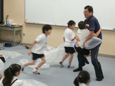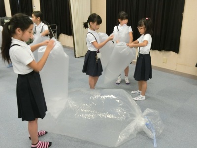 廊下を走りながら大きなビニール袋に空気を入れて膨らませ、口をしばりました。その袋を抱いて先生とぶつかり合ったり【写真中】、上に乗ったりして実験をしました。「空気はさわれないのに閉じ込めると感触がある。上に乗ると跳ね返される。空気の力かな?空気って縮むのかな?」と考えました。次の授業の水を閉じ込めてする実験も楽しみです。
