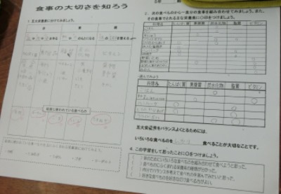 赤色【血や肉、骨をつくる】の食べ物にはたんぱく質・無機質、黄色【熱や力のもとになる】の食べ物は脂質・炭水化物、緑色【体の調子を整える】の食べ物はビタミンが多く含まれることを学びました。また、それぞれの栄養素が多く含まれる食品を知り、自分の食事にはどのような栄養素が含まれているか考えていきました。一食分の食事について、足りていない栄養素を調べ、今後どのような食べ物を意識的に増やせばいいかなどを考えました。「バランスよく食事をとることの大切さ」を学びました。