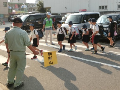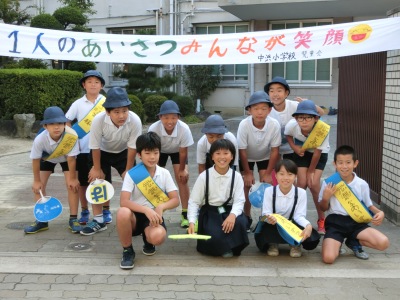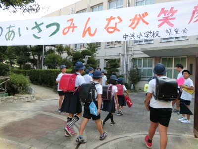 2学期になって初めてのあいさつ運動で、委員の集まりも悪かったですが、8時5分の開門には間に合いました。うちわやプラカードを持って、大きな声で、あいさつを交わしていました。横断歩道には、「中浜連合福寿会こども安心みまもり隊」の方々が、中浜交番前には「交番相談員」の方が、毎日登校する児童を見守ってくれています。今日も8時5分から15分の間には、すべての「地区別子ども会」の班が登校をしました。