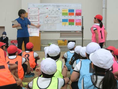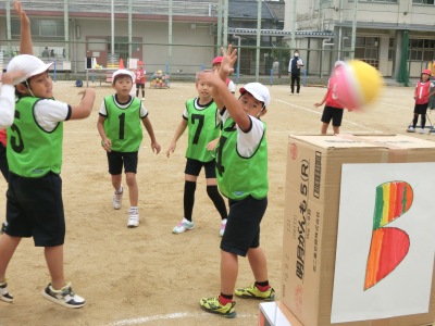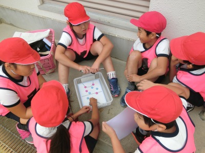 6チームに分かれて、作戦タイム【写真中】では、作戦ボードを使いながらパス&ランやパス・パス・パスなどの作戦を考えました。ゴールは3段に積んだ段ボール箱です。ゲームではパスをしながら声をかけ合い、ボールをつないでシュート【写真右】をしていきます。きそくを守りながら、チームプレイを楽しんでいました。放課後の研究討議会では、全教員が参加し熱心に討議を行い、他校の校長先生から講評をいただきました。