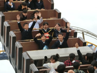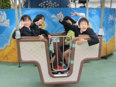 子どもたちは決めていたアトラクションへまっしぐら。スプラッシュモンスター【写真左】では、4人ずつに分かれて乗り、一気に急流をすべり落ちました。校長先生以外は、予めレインコートを着ていたので濡れずにすみました。