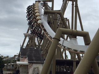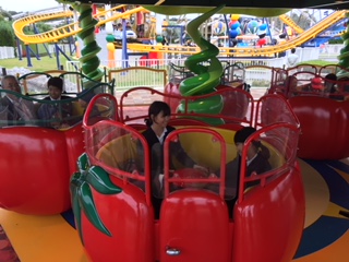 昼食後は、またアトラクションへと走っていきました。世界最大級のつり下げ式コースター「ピレネー」【写真中】にもチャレンジです。トマティーニ【写真右】に乗る班もありました。