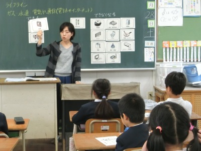 1年生では「防災ずきん兼ざぶとん」の製作で、たくさんの保護者の方に参加いただきました。2年生は「ぼうさいの学習をしよう」で、地震について学習をしました。3年生は、台風・大雨・火山噴火などの「日本の自然災害」について学習をしました。