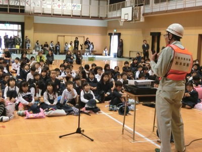 土曜授業の3限は、体育館に集合して「引渡訓練」を実施しました。最初に「自分の命は自分で守る」のDVD【写真中】をみて、校長先生から引渡訓練の目的についてお話しがありました。その後、中浜地域活動協議会防災担当の方から、明日の「地域防災訓練」について、子どもたちにお話【写真左】がありました。