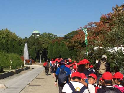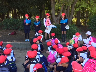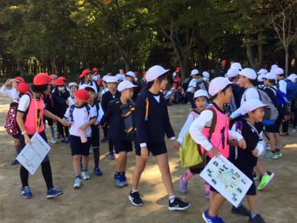 学校を出発し、なかよし班で約30分歩いて、9時30分に「太陽の広場」に着きました。早速、開会式【写真中】を行いました。今年度の全校遠足のめあては、「助け合ってハッピー笑顔あふれてハッピーなハッピースマイルウォークにしよう」です。オリエンテーリングの各ポイントでは、どんな課題がでるのか楽しみで、少しドキドキします。ルール説明の後、9時45分に1班と10班から順にポイントに向かって出発【写真右】しました。一人一人が自分の役割を果たして、楽しい一日をつくりましょう。