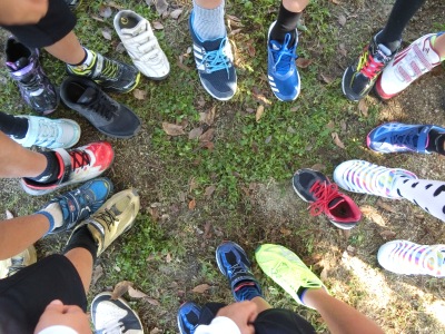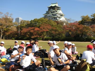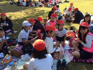 11時20分から西の丸庭園で、なかよし班ごとに昼食【写真左・中】をとりました。下の芝生は先週の雨でまだ、湿っているところがあります。全校児童全員が、同じところで昼食をとるのは初めてです。昼食後は、早速班ごとで、たんていやかくれんぼなどをして遊んでいました。