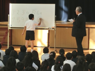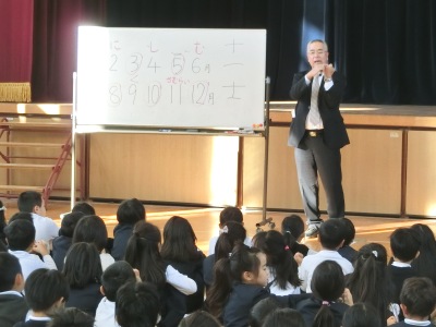 11月13日(月)始業前、今日の児童朝会は校長先生から、11月にちなんで「西向く侍」のお話がありました。小の月・大の月の覚え方をいろいろと教えてもらいました。