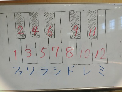 2・4・6・9月の語呂合わせで「にしむく」、11月は漢字で「十一」と書き「士」に似ていることから「さむらい」と読み、小の月は「西向く侍」と覚えるそうです。また手をグーにして「げんこつ」を作って、飛び出た骨(こぶ)と横の窪み(谷)を1月から順に進んで、こぶが大の月、谷が小の月と覚える方法も教えてもらいました。他には鍵盤ハーモニカやピアノの白と黒の鍵盤で、覚える方法【写真中】もあるそうです。