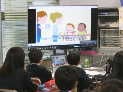 5年生【写真左】はABCソングを歌い、6年生【写真中】は英語を見て、聞いて、あいさつの学習をしました。4年生【写真右】はモジュール学習の後、赤組白組に分かれて、教室の机にアルファベットカードを順番に並べる競争をしていました。今日は赤組が1分24秒で勝利しました。