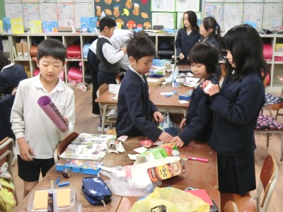 11月20日(月)2限、2年生は生活科の授業で「動くおもちゃちゃを作ろう」をしました。家から持ってきた牛乳パックやトレイ、空き箱などを使って、いろいろな動くおもちゃを作りました。牛乳パックと輪ゴムで「パッチンガエル」や「びっくりばこ」を、紙コップで「とことこカメ」や「ぴょんウサギ」などを作りました。遊びに使う物を工夫して、楽しい動くおもちゃを作っていきました。