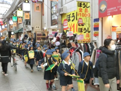 12月1日(金)午前、3年生は社会見学で、日本一長い「天神橋筋商店街」【写真左】を歩きながら調べ学習をしました。いろいろなお店や看板、商店街の様子を観察しながら、天神橋筋六丁目に向かいました。