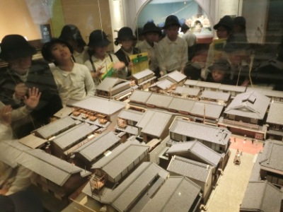 「大阪くらしの今昔館」では、3階ホールでお弁当を食べた後、昔の黒電話や行灯の実験などの「体験学習」をしました。その後、10階へ移動し、江戸時代へタイムスリップした「なにわの町家」を探訪【写真中】しました。初めて見る昔の商家や台所などに興味深々でした。その後8階に行き、明治以降の暮らしぶりを模型で再現したミュージアム「モダン大阪パノラマ遊覧」【写真右】では、明治・大正・昭和の町の表情を見学し、「大阪くらしのいま・むかし」を学習しました。