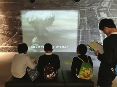 展示室では「大阪空襲」で焼き尽くされた町や戦時下の大阪のくらし、世界中が戦争をしていた時代の展示を観てまわりました。各ブースでは熱心にワークシートに記録を残していました。1階展示室では「防空壕体験」【写真右】もしました。講堂では、疎開先の火事で亡くなった子どもたちのアニメ「十六地蔵物語」を鑑賞しました。戦争の悲惨さや平和の尊さを学習することができた社会見学でした。