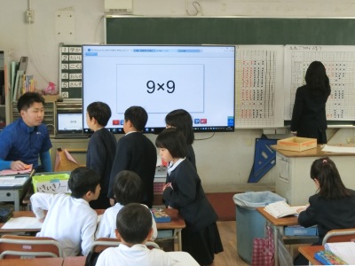 2年生【写真中】は、算数の授業で九九の暗証テストでした。合格をした児童は、「九九合格表」にシールを貼っていました。3年生【写真右】は、道徳の「共に助けあって生きる」の授業で、盲導犬ベルナのお話でした。障がいや盲導犬について学習をしました。