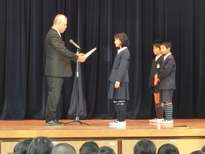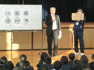 12月11日(月)、今日の児童朝会は「歯・口の健康図画・ポスターコンクール」と「城東区学校保健大会ポスター展」の賞状伝達【写真左】がありました。その後、校長先生から60年前の今日、「最初の100円銀貨」が発行されたというお話がありました。