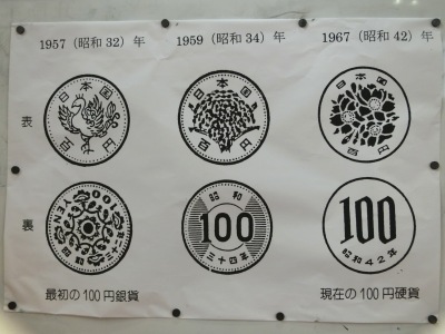 1957(昭和32)年の12月11日、「100円札」にかわって、表が鳳凰、裏は桜がデザインされた100円銀貨が発行されましたが、合金のため評判が良くありませんでした。2年後に表が稲、裏は大きく100とデザインした100円硬貨が発行され、よく似ていた50円硬貨は、周りのギザギザがなくなって、真ん中に穴があけられました。現在の銅とニッケルの白銅貨の100円硬貨は、1967年に発行されました。