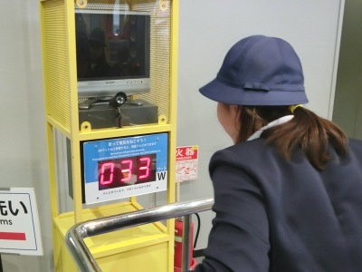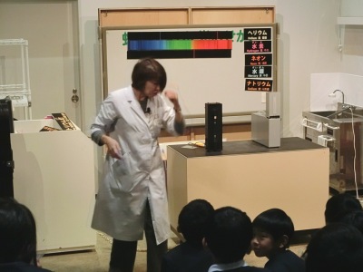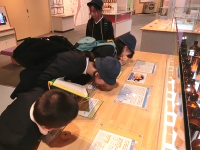 午後からは、ワークシート「たんけんラリー」を持って、班に分かれて館内の展示場の見学と体験です。3階「身近に化学」では、人が作るにおいの所【写真左】でいろいろな香りを楽しみ、サイエンスショー「虹でじっけん、光のせかい」【写真中】では、虹のできる仕組みやLEDや電球などのスペクトルの違いを学習しました。1階の「走って電気をおこそう」のコーナー【写真右】では、走って33Wの発電体験をしました。
