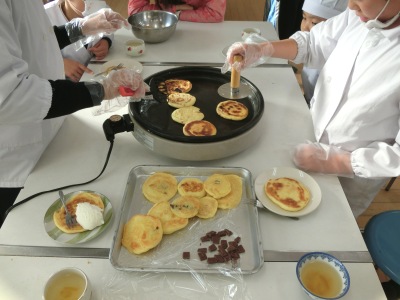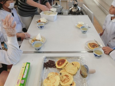 国際クラブ参加の児童と保護者、教職員が集まり、調理をしていきました。ホットㇰミックスをぬるま湯でこねてから、ホットプレートにのせて焼いていきます。中には