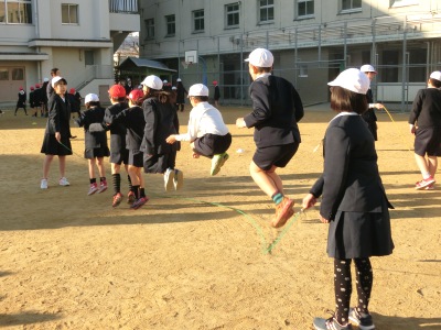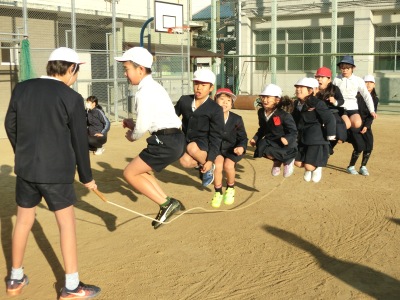 10分間で何回跳べるか、「なかよし班」対抗の競争です。今朝の気温は5度で、跳んでいるうちにだんだんと白い息が目立ってきました。声をかけたり、励ましあったりして、どの班も最後まで一生懸命に跳んでいました。18班【写真中】が113回跳び、優勝しました。