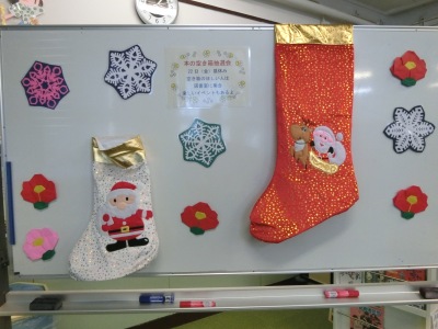 また、クリスマスにあわせて、図書館補助員さんにツリーやベルを作る「工作教室」【写真右】もしていただきました。帰りには、「しおりがもらえるチケット」や「もう1冊借りられるチケット」などのくじ引きも行い、掃除場所へと向かいました。