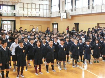 1月9日(火)、今日から3学期がスタートしました。子どもたちは、大きな荷物を持って、15日ぶりに登校してきました。9時から体育館で「3学期始業式」が行われ、校長先生からは、「3学期は50数日しかないので、一日一日を大切に過ごそう。戌年は新しい目標を立てて、努力をしたことが実を結ぶ年なので、一人一人が成長する年にしてほしい。」というお話がありました。最後は、全員で校歌を斉唱【写真中】しました。