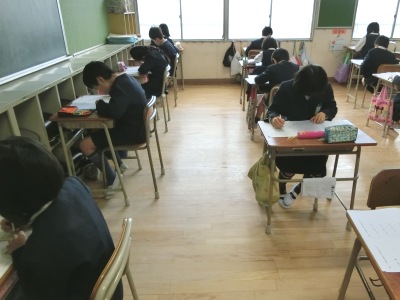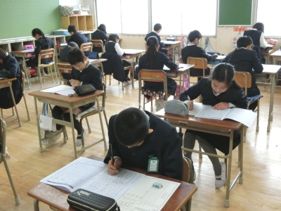 3年生【写真左】は、初めてのテストで少し緊張気味でした。4年生【写真中・右】は、国語の聞き取り問題をしていました。調査結果等については、3月中旬にお知らせする予定です。