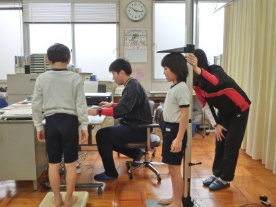 中浜小学校に「ウイルスマン」がやってきて、学校中にインフルエンザを流行らせます。「せっけんマン」と健康委員が協力して、ていねいな手洗いに取組み、ウイルスを退治をするというストーリーです。手洗いの学習をした後、身長と体重を測定【写真右】しました。みんな、2学期よりも成長していました。
