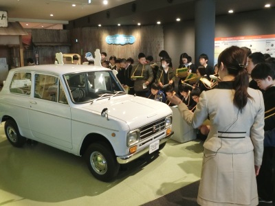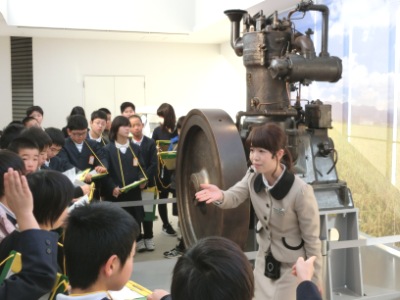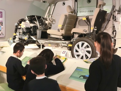 8時20分に貸切バスで出発し、「ダイハツ工業」本社池田工場へ向かいました。パビリオンでは、車の歴史や構造について学び、体験コーナー【写真右】では、車の設計やデザインなどを体験しました。工場現場に移動し、生産工程や組立ラインを見学しました。工場見学の後は、池田市の「美術の杜バスポート」へ移動しました。今日はこの冬一番の冷え込みで、最高気温は4度のため、バスの中でお弁当をいただきました。
