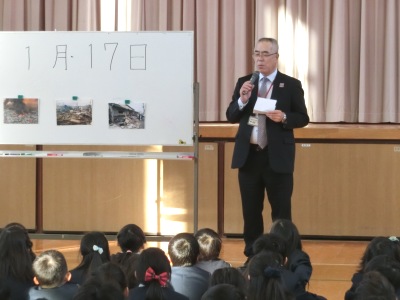 1月15日(月)、今日の児童朝会は、校長先生から23年前の「阪神・淡路大震災」での悲しいお話がありました。この大震災からボランティア活動が活発になり、平成7年12月に「防災とボランティアの日」が制定されました。その後、ボランティアの炊き出しで被災者が励まされたことから、この善意を忘れないために「おむすびの日」が設けられました。