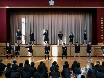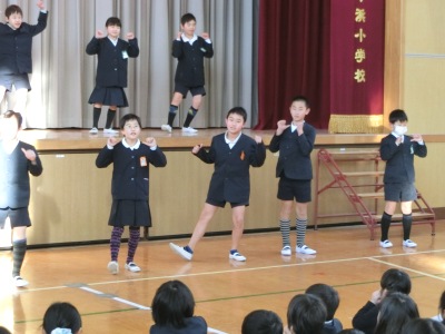 朝会の最後は、明日からの「耐寒スポーツタイム」のお知らせと、運動委員によるダンス【写真中・右】が披露されました。明日から火・金曜日が「ランニングとダンス」、水曜日が「なわとび」を行います。